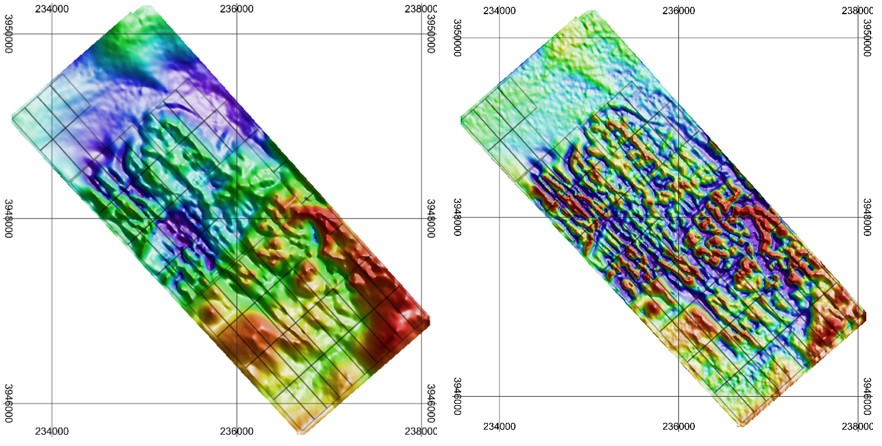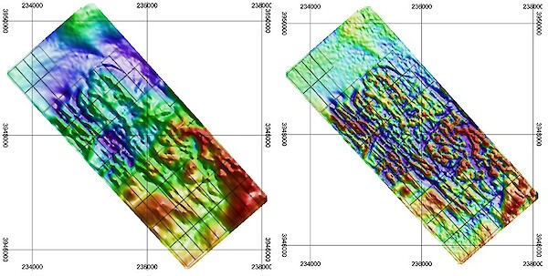 Figure 1 & 2: Reduced-to-Pole (RTP) magnetic intensity map; First vertical derivative (1VD) of the RTP magnetic data